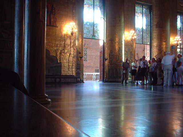 Stadshuset(市庁舎)を見に行こうとして,うっかり Râdhuset(と『地球の歩き方』の地図に書かれている建物.観光スポットではない)に行ってしまった.市庁舎はガイド付きツアーでないと一部を除き見学できないので,2時間後の次の回のツアーに参加することに.庁舎内のレストランでビュッフェ形式のランチを食べてから,14時発のガイド付きツアーに参加.20世紀初頭に建てられた気品ある建築.赤れんがの壁が印象的な「ブルーホール」,市会議場(国会と異なり保守政党の連合が多数を占めていることでも知られる)などをめぐる.写真 18 はそのもっとも美しい部屋の一つ,黄金の間.壁が全部金箔で飾られているのだけれど,俗っぽさを感じさせないのが不思議だ.ノーベル賞授賞パーティーに使われるのだという.