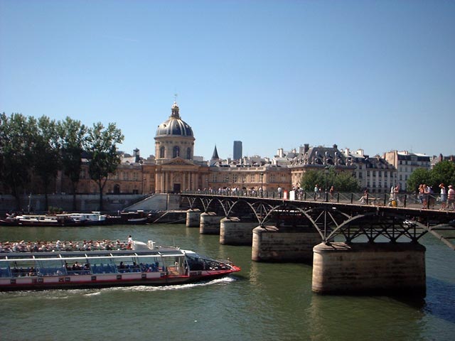 いったんセーヌ右岸に戻り,京都市の桝本市長がご執心になって一躍有名になった芸術橋 Pont des Arts へ(写真 58: 橋の向こうのドーム付き建物はフランス学士院).パリの多くの橋は建物と同じく石とモルタルで造られている外観を見せるのに対し,この橋は鋼製で,緑のペンキで塗られているのが特徴.鴨川に合うわけはなく,コピーを作るとすれば横浜などに作る方がよいのだと思う.