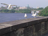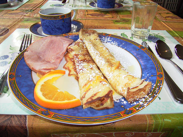 7時30分から朝食(写真 113).ジュースが3種(オレンジ,クランベリー,赤いグレープフルーツ).クレープ(写真 114)にハム.クレープのソースがおいしかったので作り方を聞いてみたら,マーマレードをオレンジジュースで延ばすのだという.皿に盛ったクレープに粉糖を振りかけて出された.その他,シリアルが何種類かと,ヨーグルト,フルーツ,コーヒー.久しぶりにちゃんとした朝食をとった気がした. 宿を出て,ネピアンポイント Nepean Point まで30分ほど歩く.ネピアンポイントはオタワ川に面して,360°の眺望が効く小高い展望台で,17世紀初頭にケベック植民地を築いたサミュエル・ド・シャンプラン Samuel de Champlain の像が立っている(写真 115). |