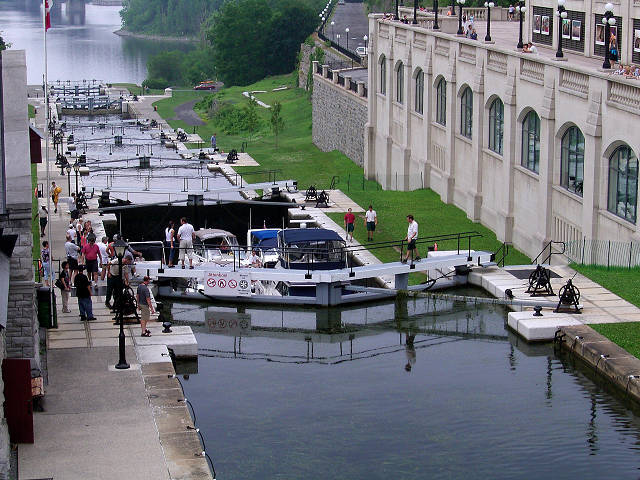 米国の独立後,イギリスの植民地にとどまる当地は米国からの軍事的脅威にさらされていた.モントリオール・キングストン間の輸送路として用いられていたセントローレンス川は,対岸が米国領なので,ひとたび開戦に至れば容易に寸断されてしまう.米英戦争(1812年-14年)を受けて運河の開削が決まり,ジョン・バイ中佐 John By により実施に移され,6年の歳月をかけて1832年に開通した.ちなみにこの運河の工事に伴ってできた町がオタワだ. 写真 145はネピアンポイントから撮影したもので,オタワ川との合流部分の水門7個ほどと,水門の管理棟を望むことができる.写真右下の部分がオタワ川で,いくつもの水門を経て奥に見える橋の方向の上流区間に到達する.左手には豪華ホテルのフェアモント・シャトー・ローリエ,右手には国会議事堂の端の部分が写っている. |